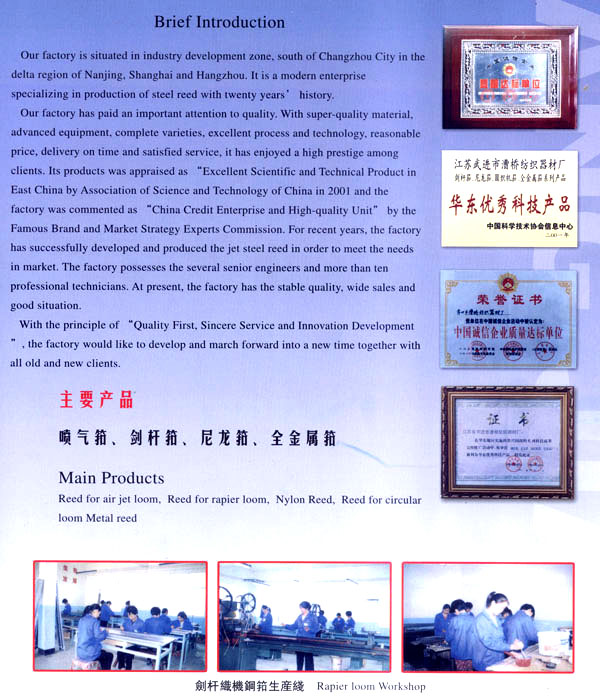 漕橋紡織器材廠位于常州市南郊寧、滬、杭金三角漕橋工業(yè)開(kāi)發(fā)區(qū),是全國(guó)專(zhuān)業(yè)生產(chǎn)鋼筘規(guī)模較大的現(xiàn)代化廠家,已具有20年的歷史。 本廠生產(chǎn)的鋼筘有噴氣、劍桿筘、尼龍?bào)亍A織機(jī)筘和金屬筘分鉸筘、織帶筘、無(wú)梭織帶筘……本廠特別擅長(zhǎng)生產(chǎn)高密度的劍桿筘。 本廠素以質(zhì)量為重,均采用優(yōu)質(zhì)材料制筘,如噴氣筘使用的筘片膠水鋁架等,均采用日本進(jìn)口的材料;劍桿筘筘片采用日本進(jìn)口的57B線材,膠水均采用紡織部定點(diǎn)的陜西紡織研究所生產(chǎn)的優(yōu)質(zhì)膠水、高密度劍桿筘均用進(jìn)口膠水制筘;全金屬筘均用云南的優(yōu)質(zhì)錫制筘。 各種鋼筘筘面的平整度,筘齒的均勻度、垂直度,筘片的彈性度,膠水的牢固度廣大用戶(hù)使用后感到滿意放心,特別是使用壽命特別長(zhǎng),受到用戶(hù)一致的盛贊,真是料好筘好,筘好布好。 本廠為了使質(zhì)量精益求精,增添了不少先進(jìn)設(shè)備,并聘請(qǐng)了數(shù)名高級(jí)工程師和十多位具有專(zhuān)業(yè)知識(shí)的技術(shù)人員把關(guān)。由于質(zhì)量穩(wěn)定可靠,2001年被中國(guó)科學(xué)技術(shù)協(xié)會(huì)評(píng)為“華東優(yōu)秀科技產(chǎn)品”二00二年被中國(guó)管理科學(xué)研究院名牌與市場(chǎng)戰(zhàn)略專(zhuān)家委員會(huì)評(píng)為“中國(guó)誠(chéng)信企業(yè)質(zhì)量達(dá)標(biāo)單位”。 今本廠產(chǎn)品暢銷(xiāo)全國(guó)20多個(gè)省市,價(jià)格優(yōu)惠,供不應(yīng)求,形勢(shì)喜人。 本廠本著“以質(zhì)取勝、誠(chéng)信服務(wù)、創(chuàng)新發(fā)展”的宗旨,愿與廣大新老客戶(hù)攜手共肩,昂首走進(jìn)新時(shí)代,迎接新的挑戰(zhàn)。