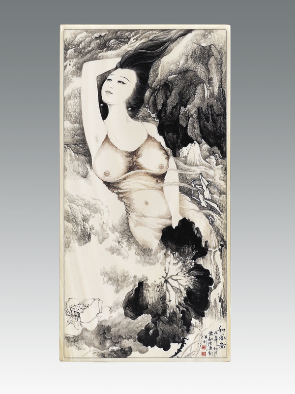 1 牙刻《和風(fēng)圖》是極具創(chuàng)意構(gòu)思新穎的原創(chuàng)作品,水墨雅韻橫生,荷花玉色高潔,仙子和風(fēng)飄逸。作品以花擬人以人喻花,兼工帶寫(xiě)相應(yīng)成輝,刀法隨意而變,大膽強(qiáng)調(diào)紅與黑的民族審美符號(hào),抒發(fā)作者對(duì)美的呼喚、對(duì)荷的傾訴。仙子冰雪的肌膚,豐美的體態(tài),洋溢著青春的氣息,散發(fā)出蓬勃的生機(jī)。