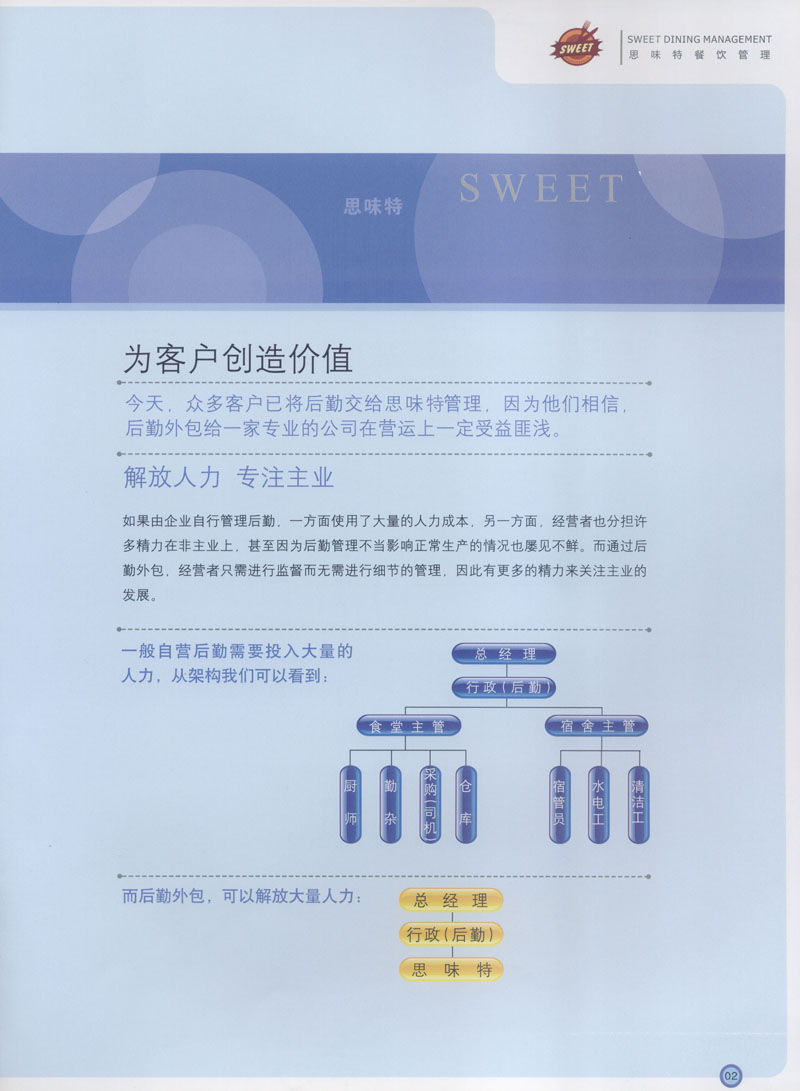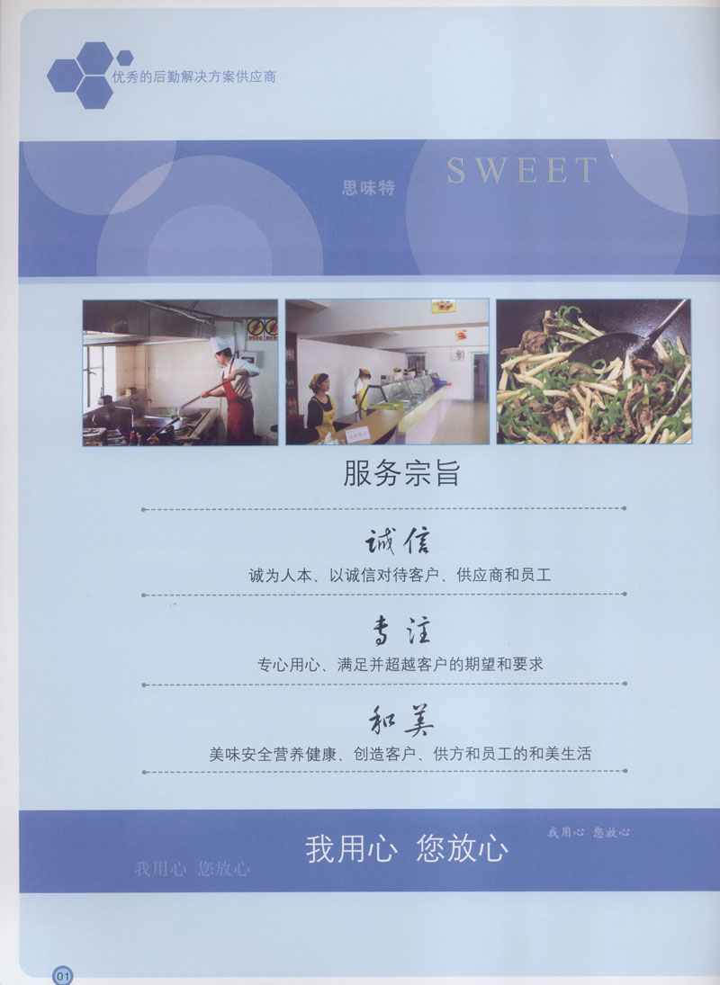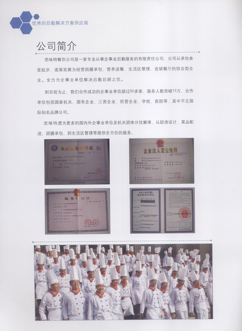常州市思味特餐飲有限公司是一家專業(yè)從事企事業(yè)后勤服務(wù)的有限責(zé)任公司,公司從承包食堂起步,逐漸發(fā)展為經(jīng)營團膳承包、營養(yǎng)送餐、生活區(qū)管理、連鎖餐廳的綜合型企業(yè)。2008年公司斥資100萬元,在常州興建了可以同時提供3000餐膳食的中央廚房,重點打造“和美客”后勤服務(wù)品牌,全力為企事業(yè)單位解決后勤后顧之憂。