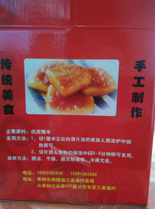 主要原料:優(yōu)質(zhì)糯米 食用方法:1、切1厘米左右的薄片油煎或放入微波爐中加熱即可。 2、切片放入快熱的稀飯中悶3-5分鐘即可食用。 保存方法:陰涼、干燥、避光處保存、冷藏尤佳。
