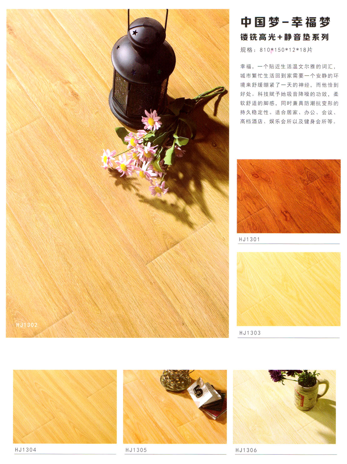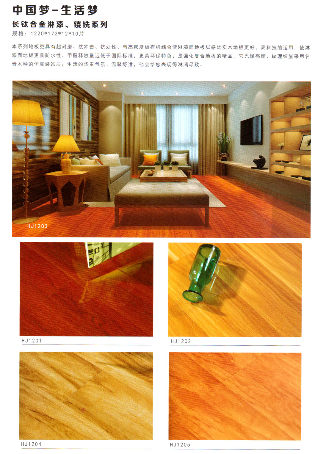 目前我們主要經(jīng)營“惠居”、  “靈盛”牌木質強化地板,現(xiàn)在已經(jīng)開發(fā)出水晶面、羽絲面、浮雕面、立體刀砍紋、手抓紋、4v仿實木、金剛淋漆面、模壓面、橡木真木紋、防水系列等多個系列產(chǎn)品,涵蓋了市場上所出現(xiàn)的所有產(chǎn)品系列!