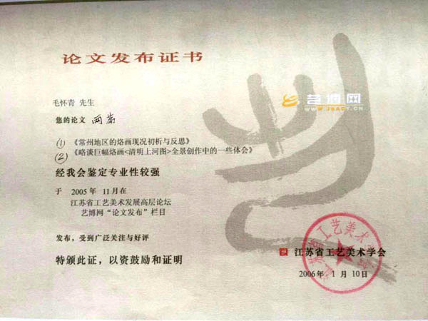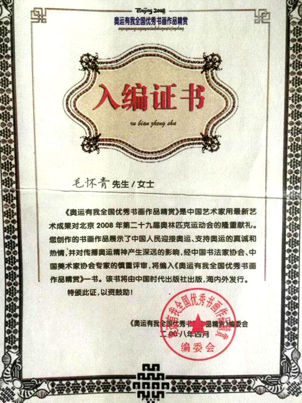 毛懷青,江蘇常州市武進(jìn)人。 中國工藝美術(shù)學(xué)會會員,常州市中國烙畫研究會副會長,常州市文博鑒賞協(xié)會理事,非物質(zhì)文化遺產(chǎn)烙畫傳承人。高級工藝美術(shù)師。 年輕時(shí)學(xué)習(xí)國畫、油畫中年蔓現(xiàn)掌州咯畫源遠(yuǎn)流長、歷史悠久,有著其它美術(shù)門類不具備的藝術(shù)風(fēng)格與特色?芍^是工藝美術(shù)中的一朵十分亮麗的藝術(shù)奇葩,是我民族先人給我們留下的一份不可多得十分珍貴的一份文化遺產(chǎn)。為弘揚(yáng)與發(fā)展這份優(yōu)秀文化遺產(chǎn),我從此下定決心研究烙畫,愿付出一份力量為振興烙畫事業(yè)做出貢獻(xiàn)。至今已潛心研究幾十年,取得了可喜的成績,被業(yè)界公認(rèn),社會關(guān)注與認(rèn)可。有“江南烙畫第一筆”之美譽(yù)。 近年來,創(chuàng)作的烙畫作品分別獲得過全國、省市級的金、銀、銅獎多次。中央電視臺曾兩次播放過本人的烙畫作品,江蘇電視臺、常州電視臺也曾多次播放過本人的作品與烙畫藝術(shù)生涯,揚(yáng)子晚報(bào)、常州日報(bào)、常州晚報(bào)也曾多次報(bào)導(dǎo)過本人的烙畫作品,出版物有三種版本都能查閱到介紹本的烙畫從藝生涯與藝術(shù)業(yè)績。