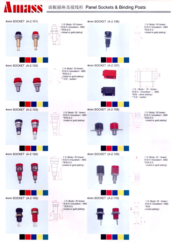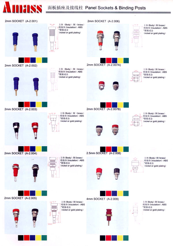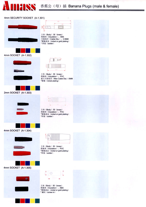 本公司專業(yè)生產(chǎn)各類香蕉插頭,香蕉插座,接線柱,電瓶夾,鱷魚夾,測試導(dǎo)線,測試筆等。產(chǎn)品分2mm/2.5mm/3mm/3.5mm/4mm五大系列,百余種款式, 各種香蕉插廣泛用于儀器、儀表、電力測試、教學(xué)、玩具,視聽設(shè)備、醫(yī)療儀器,保健產(chǎn)品等領(lǐng)域。公司技術(shù)力量雄厚,生產(chǎn)工藝先進(jìn),產(chǎn)品遠(yuǎn)銷港、臺、歐美,并與飛利浦等國際品牌配套。公司本著精益求精的理念,歡迎新老客戶光臨。 我們擁有資深的工程師和豐富的電子產(chǎn)品銷售經(jīng)驗,專業(yè)生產(chǎn)各類電子接插件產(chǎn)品。 香蕉插頭,香蕉插座,電瓶夾,鱷魚夾等品種齊全、 質(zhì)量可靠,致力服務(wù)于通訊、數(shù)據(jù)通信、消費類電子產(chǎn)品、計算機和計算機外圍設(shè)備以及工業(yè)應(yīng)用等領(lǐng)域,能給客戶提供全面采購解決方案。 我們秉承穩(wěn)健作風(fēng)、誠實經(jīng)營、合理價格、完善服務(wù)的宗旨,在全體客戶的支持下,公司不斷創(chuàng)新進(jìn)取,業(yè)績蒸蒸日上,已與數(shù)十家電子零件制造商及其分支機構(gòu)建立密切合作關(guān)系,在國內(nèi)擁有數(shù)百家固定客戶。