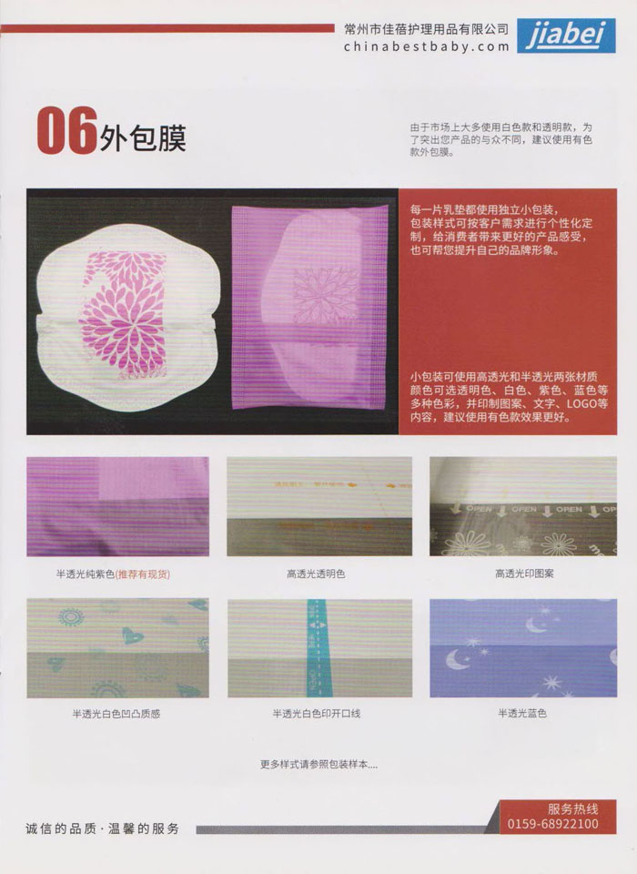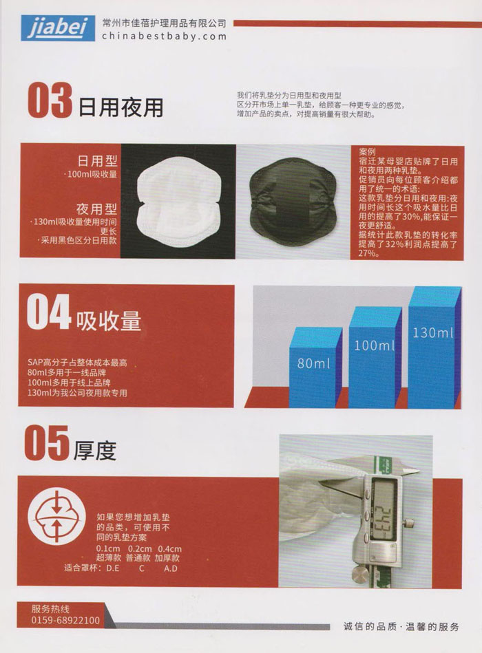 常州市佳蓓護理用品有限公司是一家專業(yè)從事開發(fā)、生產(chǎn)、銷售并具備自營出口的外向型企業(yè),主要生產(chǎn)“一次性防溢乳墊“,以質(zhì)量穩(wěn)定,柔軟親膚而深受客戶和消費者青睞。本公司產(chǎn)品從生產(chǎn)到包裝成品嚴(yán)格執(zhí)行無菌生產(chǎn)標(biāo)準(zhǔn)化流程,并和設(shè)備生產(chǎn)廠家合作開發(fā)了兩條從進料、生產(chǎn)、檢測、滅菌、成品包裝的無菌生產(chǎn)線,從而實現(xiàn)了真正意義上的無菌生產(chǎn)標(biāo)準(zhǔn)化。 佳蓓秉承”用戶至上“的原則,期待與國內(nèi)外客戶真誠合作,同時也誠邀品牌公司貼牌合作,歡迎您的蒞臨和指導(dǎo),與我們攜手合作,共創(chuàng)未來。