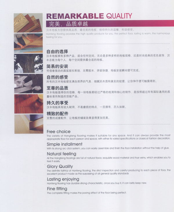 常州漢豐裝飾材料有限公司是一家涉及強化地板制造、屏風鋁材生產、進出口貿易的大型公司。2001年公司投入重資.全面引進世界頂級一體化自動流水生產線和具有國際先進水準的德國權威木地板生產技術,興建強化地板生產基地。多年以來.一直不斷加強生產設備、廠房基礎投入,目前公司年生產強化地板能力已經達到了500萬平方米,步入國內一流行列,具備了雄厚的國際競爭力。 漢豐地板以奉獻生活中最完美的地板為發(fā)展目標,時尚流行的設計風格和多樣化的產品類型,贏得了市場的廣泛贊譽和肯定。產品嚴格按照歐洲標準檢測強化木地板的各項性能指標.達到百分百的國際技術標準,確保了每一塊地板都有著上乘品質,是綠色環(huán)保的好地板。并先后通過了Isc)9001國際質量管理體系認證,IS014001國際環(huán)境管理體系認證.中國環(huán)境標志產品認證,深得用戶的一致好評,是寫字樓、商場、大型超市、學校、建筑樓宇、娛樂場所、家用私宅等鋪裝的首選地板。