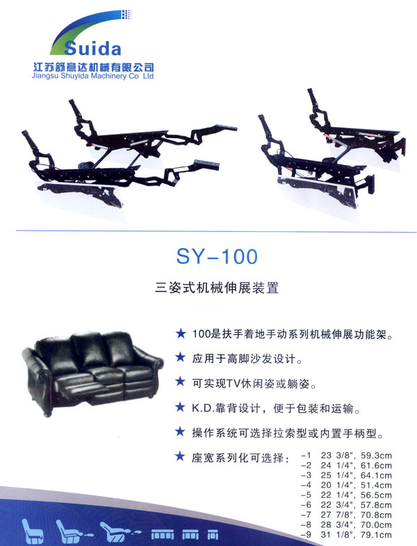 江蘇舒意達機械有限公司是一家集研發(fā)設(shè)計,生產(chǎn)制造及銷售的專業(yè)家具五金企業(yè)。公司成立于2006年,座落于風(fēng)景秀麗的江南常州,交通運輸?shù)锰飒毢,為海?nèi)外客商的來往交流,洽談和供貨提供了諸多便利,公司占地面積28000平方米,生產(chǎn)廠房面積18000平方米,獨立的辦公樓,擁有良好的工作環(huán)境。 我們的經(jīng)營思理念:堅持以人為本,科技為先,用先進的設(shè)備,好的工藝流程制造一流的產(chǎn)品。 我們的口號:保證以優(yōu)秀的品質(zhì)服務(wù)于客人,我們的目標:研發(fā)更多舒適的產(chǎn)品,帶來生活的享受。 公司誠邀海內(nèi)外客商前來指導(dǎo)洽談,攜手共進,共造雙贏。