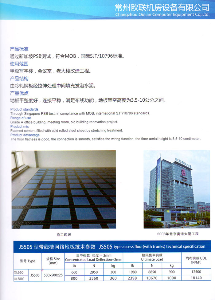 防靜電高架活動(dòng)地板、全鋼地板、陶瓷地板是計(jì)算機(jī)行業(yè)發(fā)展起來的新型鋪地材料,隔離了潮氣、靜電灰塵,最重要的是解決了綜合布線問題,無需預(yù)埋管線,可隨時(shí)拆卸、搬移,保證了資訊設(shè)備完整的優(yōu)點(diǎn),適應(yīng)了智能化樓宇中信息自動(dòng)化技術(shù)對(duì)所處環(huán)境的特定要求,避免了廣大客戶的雙重投資,使現(xiàn)代化辦公程度更加高效,辦公場(chǎng)所更加舒適。 “歐聯(lián)”系列全鋼地板,符合國(guó)家安全要求,種類完備多樣,其中防靜電陶瓷地板、硫酸鈣地板等除具有普通瓷質(zhì)的裝飾和實(shí)用性外,其耐磨、防水、防火功能優(yōu)于其它同類產(chǎn)品,防靜電系列地板,能切合不同客戶的要求,其靈活的配置,深受客戶歡迎,不同材質(zhì)的地板結(jié)構(gòu)使設(shè)計(jì)師的設(shè)計(jì)空間比傳統(tǒng)的更加廣闊自由和善變。 公司大力發(fā)展國(guó)內(nèi)外銷售業(yè)務(wù),多次中標(biāo)國(guó)內(nèi)重點(diǎn)工程 ,例:哈爾濱醫(yī)科大學(xué)、山東大學(xué)、上海普通機(jī)場(chǎng)等。 公司將一如既往開發(fā)和制造一流的產(chǎn)品,愿與廣大有識(shí)之士合作發(fā)展,共創(chuàng)美好未來。