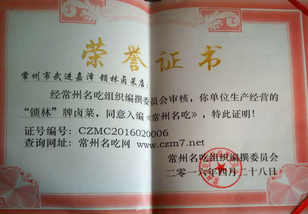 武進(jìn)區(qū)嘉澤老街十字路口,有一家不起眼的鹵菜專賣店,店面雖然不大,但一年365天每天來(lái)購(gòu)買(mǎi)鹵菜的消費(fèi)者卻絡(luò)繹不絕。 這家鹵菜店名叫鎖林鹵菜店,店主名叫萬(wàn)鎖林。 今年已花甲之年的萬(wàn)鎖林,出生在武進(jìn)區(qū)的一個(gè)鹵菜世家。解放前,正逢亂世,1927年其父萬(wàn)友良17歲隨父從蘇北海安至夏溪鎮(zhèn)落戶,全家以經(jīng)營(yíng)小吃、鹵菜為生。1956年萬(wàn)友良經(jīng)營(yíng)的鹵菜小吃店公私合營(yíng),起名為東方飯店(后改名為夏溪飯店),萬(wàn)友良帶領(lǐng)其七個(gè)兒子全部從事餐飲事業(yè)。1972年,排行第六的萬(wàn)鎖林初中畢業(yè)被分配到嘉澤飯店工作,直至1982年夫妻倆著手創(chuàng)辦鎖林鹵菜館,專業(yè)從事鹵菜的加工和銷售。 鎖林鹵菜采用祖?zhèn)髋浞,制作工藝?jīng)清洗—汆水—再清洗—油汆—加料—燒制—包裝等多道工序。萬(wàn)鎖林在祖?zhèn)髅胤降幕A(chǔ)上,不斷探索創(chuàng)新,使鹵菜口味更加香醇可口。他還在菜肴中加入茴香、陳皮、桂皮等20多種中草藥,使產(chǎn)品兼具食用保健作用。 由于鎖林鹵菜色、香、味俱佳,而且價(jià)格合理,遠(yuǎn)近數(shù)十里群眾紛紛前來(lái)選購(gòu)目前,該店已形成鴨頭、雞爪、豬頭肉、五香牛肉等四大系列,產(chǎn)品遠(yuǎn)銷北京、上海、浙江、海南及蘇、錫、常各地,深受各地消費(fèi)者青睞。 購(gòu)買(mǎi)地址: 一、嘉澤鎮(zhèn)菜市場(chǎng)內(nèi) 二、嘉澤鎮(zhèn)老街十字路口 電話:0519-83802086 訂購(gòu)熱線:18915002160