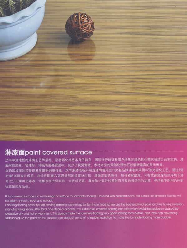 常州漢豐裝飾材料有限公司是一家涉及強化地板制造、屏風(fēng)鋁材生產(chǎn)、進出口貿(mào)易的大型公司。2001年公司投入重資.全面引進世界頂級一體化自動流水生產(chǎn)線和具有國際先進水準(zhǔn)的德國權(quán)威木地板生產(chǎn)技術(shù),興建強化地板生產(chǎn)基地。多年以來.一直不斷加強生產(chǎn)設(shè)備、廠房基礎(chǔ)投入,目前公司年生產(chǎn)強化地板能力已經(jīng)達到了500萬平方米,步入國內(nèi)一流行列,具備了雄厚的國際競爭力。 漢豐地板以奉獻生活中最完美的地板為發(fā)展目標(biāo),時尚流行的設(shè)計風(fēng)格和多樣化的產(chǎn)品類型,贏得了市場的廣泛贊譽和肯定。產(chǎn)品嚴(yán)格按照歐洲標(biāo)準(zhǔn)檢測強化木地板的各項性能指標(biāo).達到百分百的國際技術(shù)標(biāo)準(zhǔn),確保了每一塊地板都有著上乘品質(zhì),是綠色環(huán)保的好地板。并先后通過了Isc)9001國際質(zhì)量管理體系認(rèn)證,IS014001國際環(huán)境管理體系認(rèn)證.中國環(huán)境標(biāo)志產(chǎn)品認(rèn)證,深得用戶的一致好評,是寫字樓、商場、大型超市、學(xué)校、建筑樓宇、娛樂場所、家用私宅等鋪裝的首選地板。