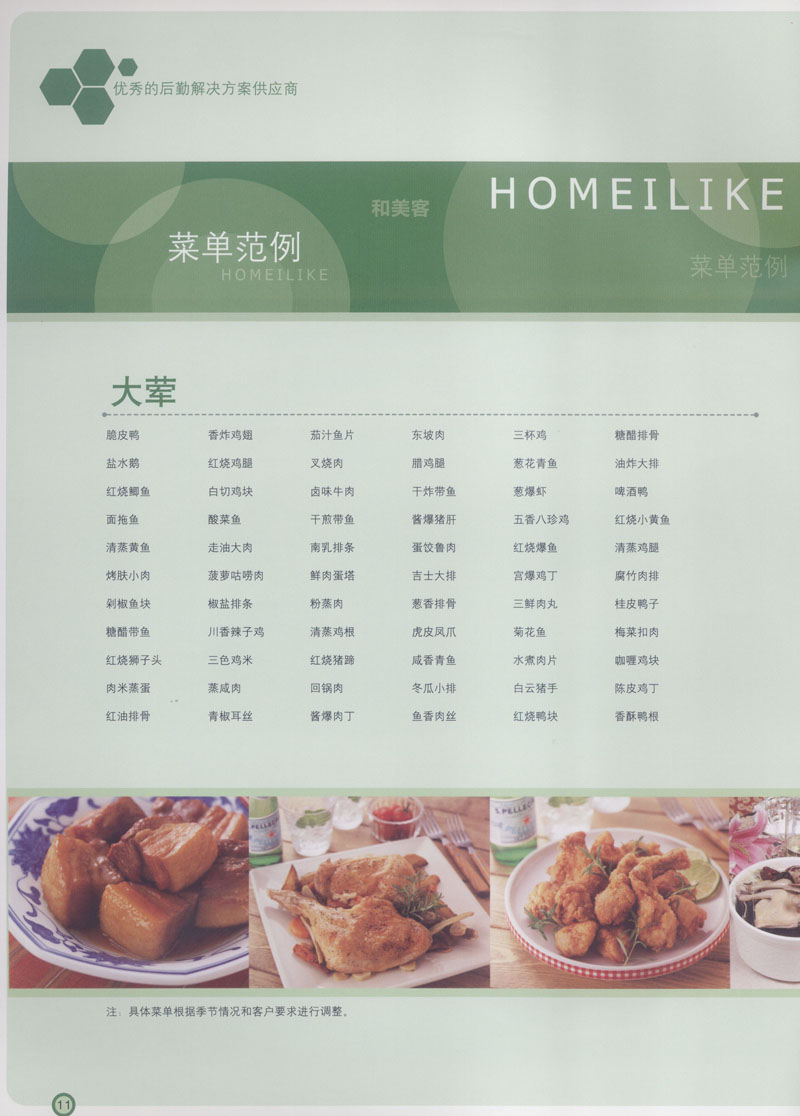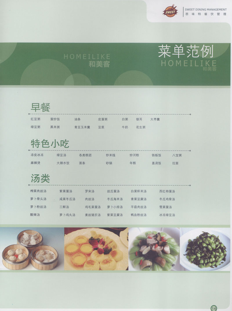 常州市思味特餐飲有限公司是一家專業(yè)從事企事業(yè)后勤服務(wù)的有限責任公司,公司從承包食堂起步,逐漸發(fā)展為經(jīng)營團膳承包、營養(yǎng)送餐、生活區(qū)管理、連鎖餐廳的綜合型企業(yè)。2008年公司斥資100萬元,在常州興建了可以同時提供3000餐膳食的中央廚房,重點打造“和美客”后勤服務(wù)品牌,全力為企事業(yè)單位解決后勤后顧之憂。 到目前為止,我們合作成功的企事業(yè)單位超過50多家,服務(wù)人數(shù)突破15萬,合作單位包括國家機關(guān)、國有企業(yè)、三資企業(yè)、民營企業(yè)、學校、醫(yī)院等,其中不乏國際知名品牌公司。 和美客愿為更多的國內(nèi)外企事業(yè)單位及機關(guān)團體分憂解難,從廚房設(shè)計、菜品配送、團膳承包、到生活區(qū)管理等提供全方位的服務(wù)。