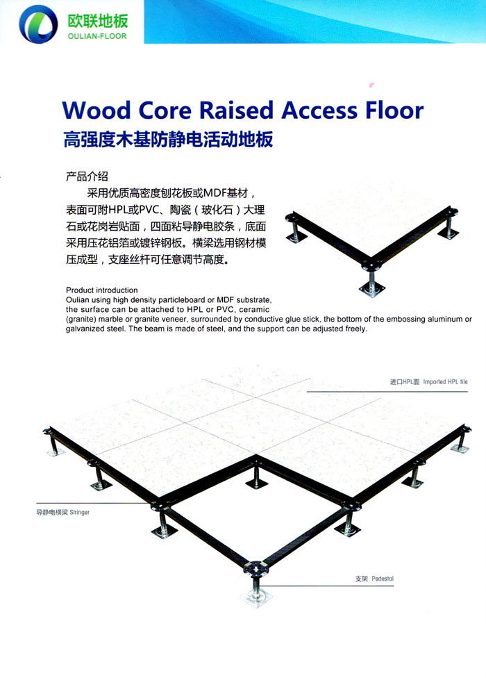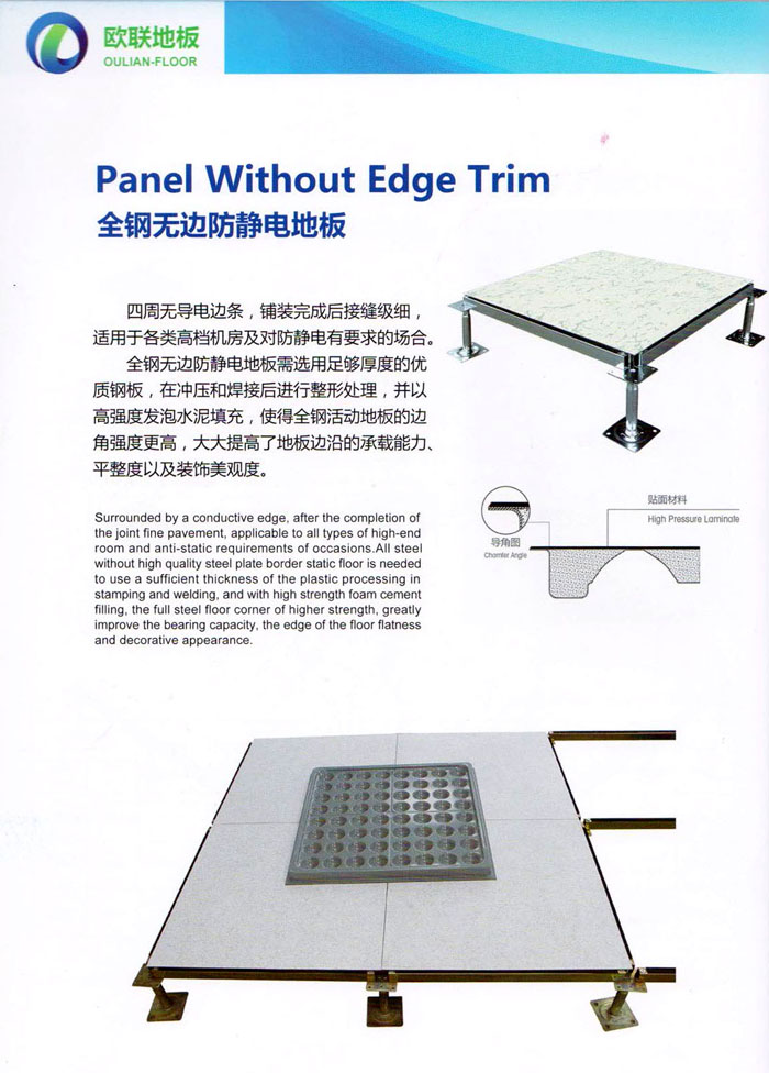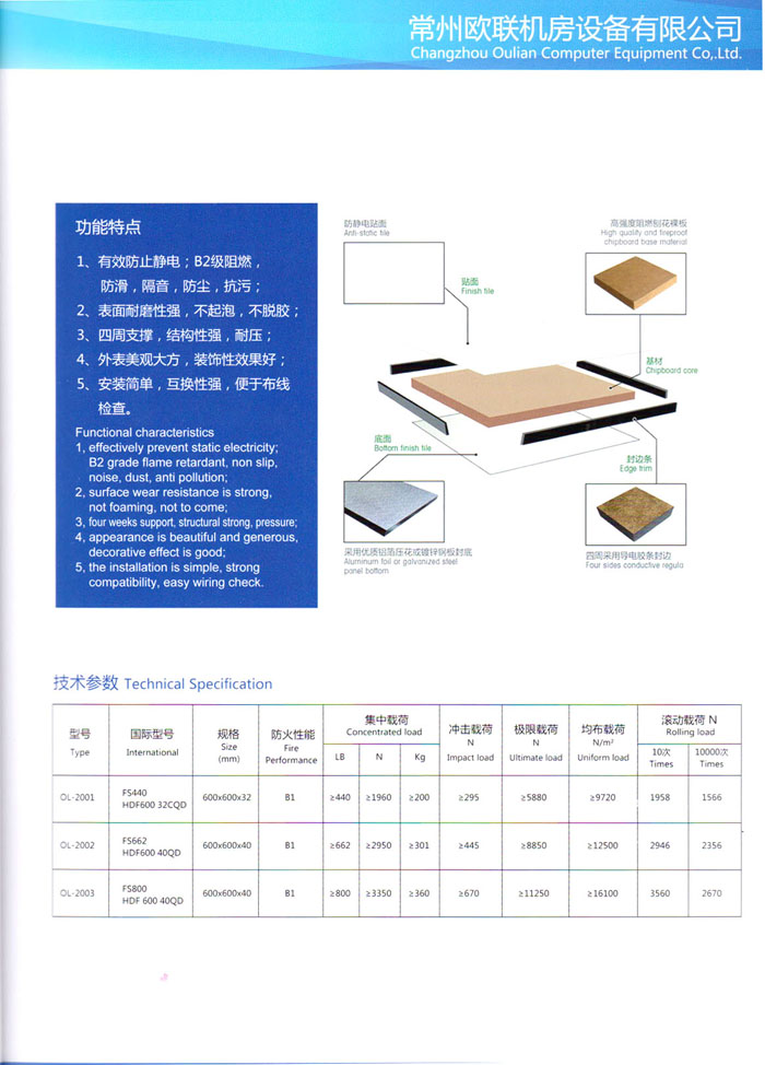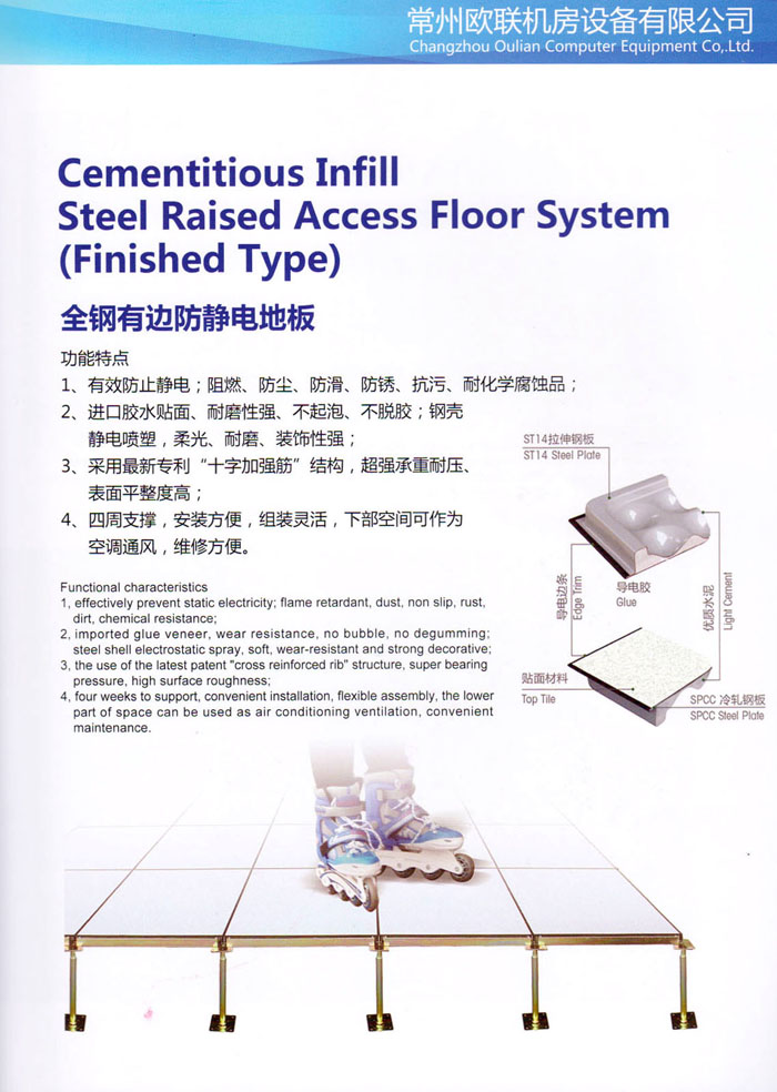 防靜電高架活動(dòng)地板、全鋼地板、陶瓷地板是計(jì)算機(jī)行業(yè)發(fā)展起來的新型鋪地材料,隔離了潮氣、靜電灰塵,最重要的是解決了綜合布線問題,無需預(yù)埋管線,可隨時(shí)拆卸、搬移,保證了資訊設(shè)備完整的優(yōu)點(diǎn),適應(yīng)了智能化樓宇中信息自動(dòng)化技術(shù)對(duì)所處環(huán)境的特定要求,避免了廣大客戶的雙重投資,使現(xiàn)代化辦公程度更加高效,辦公場(chǎng)所更加舒適。 “歐聯(lián)”系列全鋼地板,符合國家安全要求,種類完備多樣,其中防靜電陶瓷地板、硫酸鈣地板等除具有普通瓷質(zhì)的裝飾和實(shí)用性外,其耐磨、防水、防火功能優(yōu)于其它同類產(chǎn)品,防靜電系列地板,能切合不同客戶的要求,其靈活的配置,深受客戶歡迎,不同材質(zhì)的地板結(jié)構(gòu)使設(shè)計(jì)師的設(shè)計(jì)空間比傳統(tǒng)的更加廣闊自由和善變。 公司大力發(fā)展國內(nèi)外銷售業(yè)務(wù),多次中標(biāo)國內(nèi)重點(diǎn)工程 ,例:哈爾濱醫(yī)科大學(xué)、山東大學(xué)、上海普通機(jī)場(chǎng)等。 公司將一如既往開發(fā)和制造一流的產(chǎn)品,愿與廣大有識(shí)之士合作發(fā)展,共創(chuàng)美好未來。