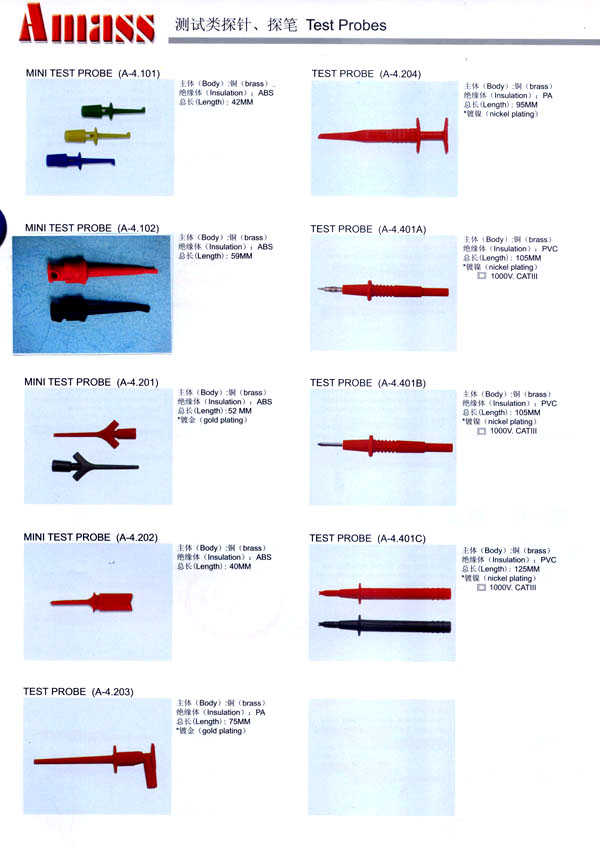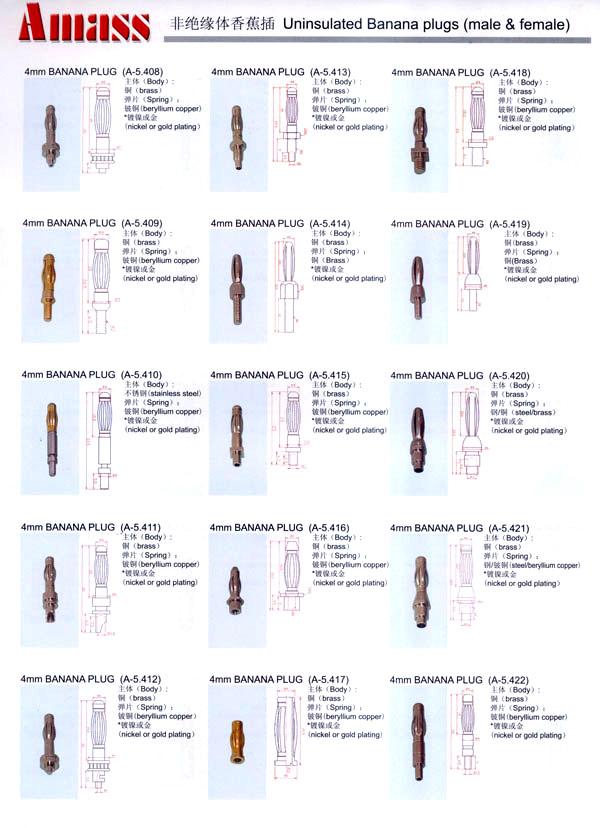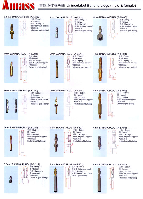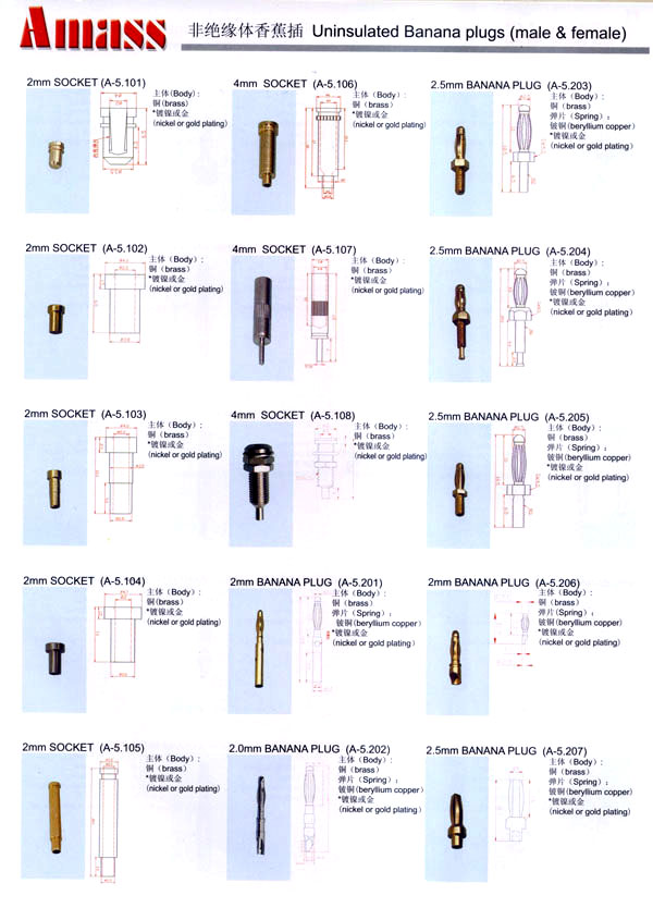 本公司專業(yè)生產(chǎn)各類香蕉插頭,香蕉插座,接線柱,電瓶夾,鱷魚夾,測(cè)試導(dǎo)線,測(cè)試筆等。產(chǎn)品分2mm/2.5mm/3mm/3.5mm/4mm五大系列,百余種款式, 各種香蕉插廣泛用于儀器、儀表、電力測(cè)試、教學(xué)、玩具,視聽設(shè)備、醫(yī)療儀器,保健產(chǎn)品等領(lǐng)域。公司技術(shù)力量雄厚,生產(chǎn)工藝先進(jìn),產(chǎn)品遠(yuǎn)銷港、臺(tái)、歐美,并與飛利浦等國際品牌配套。公司本著精益求精的理念,歡迎新老客戶光臨。