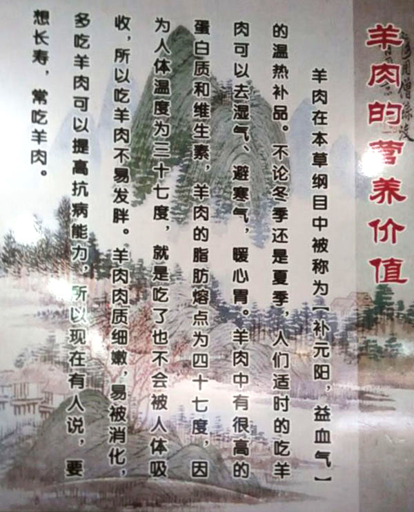 羊肉性溫?zé)、補(bǔ)氣滋陽(yáng)、暖中補(bǔ)氣、開胃健脾、還可以去濕氣避寒冷,暖胃寒、養(yǎng)吃百草、養(yǎng)根據(jù)自身生理需要選擇草木、固羊有“百藥之庫(kù)”之稱。古人云:多吃羊肉、健康長(zhǎng)壽。