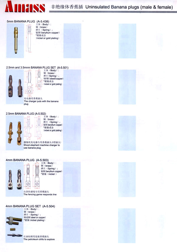 本公司專業(yè)生產(chǎn)各類香蕉插頭,香蕉插座,接線柱,電瓶夾,鱷魚夾,測試導線,測試筆等。產(chǎn)品分2mm/2.5mm/3mm/3.5mm/4mm五大系列,百余種款式, 各種香蕉插廣泛用于儀器、儀表、電力測試、教學、玩具,視聽設備、醫(yī)療儀器,保健產(chǎn)品等領域。公司技術力量雄厚,生產(chǎn)工藝先進,產(chǎn)品遠銷港、臺、歐美,并與飛利浦等國際品牌配套。公司本著精益求精的理念,歡迎新老客戶光臨。 我們擁有資深的工程師和豐富的電子產(chǎn)品銷售經(jīng)驗,專業(yè)生產(chǎn)各類電子接插件產(chǎn)品。 香蕉插頭,香蕉插座,電瓶夾,鱷魚夾等品種齊全、 質(zhì)量可靠,致力服務于通訊、數(shù)據(jù)通信、消費類電子產(chǎn)品、計算機和計算機外圍設備以及工業(yè)應用等領域,能給客戶提供全面采購解決方案。 我們秉承穩(wěn)健作風、誠實經(jīng)營、合理價格、完善服務的宗旨,在全體客戶的支持下,公司不斷創(chuàng)新進取,業(yè)績蒸蒸日上,已與數(shù)十家電子零件制造商及其分支機構建立密切合作關系,在國內(nèi)擁有數(shù)百家固定客戶。