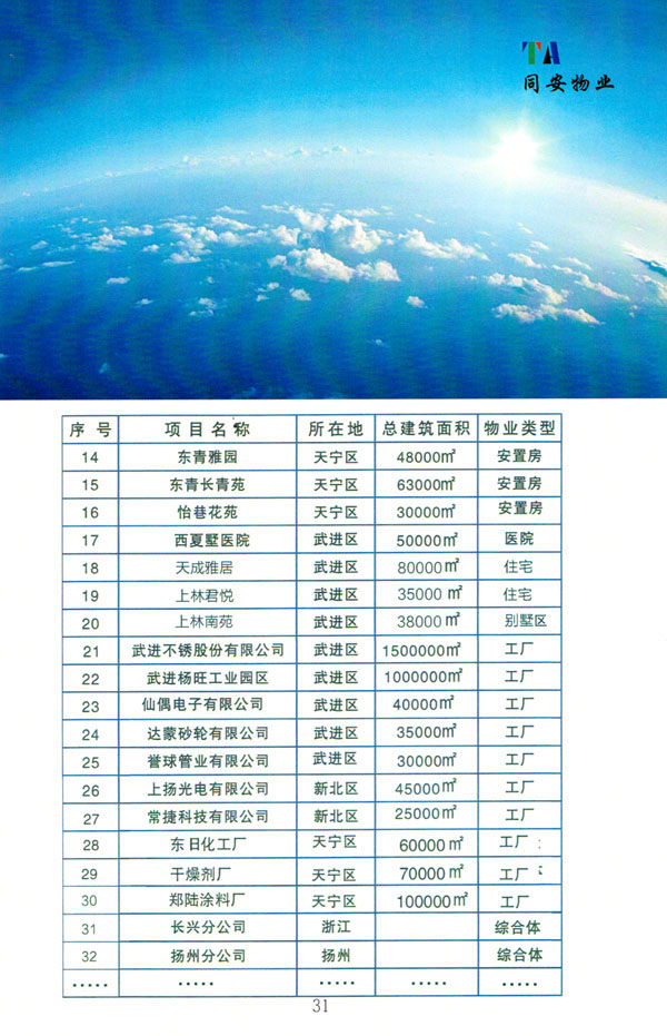 常州市同安物業(yè)管理有限公司注冊(cè)1999年,發(fā)展至今已有多年歷史,本公司坐落于美麗的龍城常州,秉承“融聚無(wú)限未來(lái)”的核心理念,融專業(yè)認(rèn)才,匯優(yōu)質(zhì)資源以”專心,細(xì)心,耐心”的服務(wù)態(tài)度,為客戶打造“安心,順心,稱心”的服務(wù)感受。 公司始終以“打造中國(guó)最值得信賴和最值得尊重的物業(yè)管理服務(wù)集成商”為愿景自我鞭策,不斷前行。同安物業(yè)以客戶滿意為終極目標(biāo),不斷加強(qiáng)”崗位資格認(rèn)證能力,人才招聘與職業(yè)化培訓(xùn)能力,產(chǎn)品策劃與管理設(shè)計(jì)能力,品質(zhì)監(jiān)督與管控能力,技術(shù)更新與運(yùn)營(yíng)優(yōu)化力“五大專業(yè)能力的培養(yǎng)和提升,實(shí)現(xiàn)“精品化管理,專業(yè)化服務(wù)”。 公司發(fā)展至今,員工總數(shù)近千余人,大專以上學(xué)歷200多人,中高級(jí)技術(shù)人員160人,維修人員140人,物業(yè)管理師80名,公司接管面積達(dá)3100000多平方米,設(shè)涉及住宅小區(qū),別墅,大型游樂(lè)場(chǎng),公園,醫(yī)院,廠區(qū),商業(yè)等。公司的工作管理逐步導(dǎo)入ISO9001質(zhì)量體系和ISO4001環(huán)境管理體系和GB/T28001職業(yè)健康安全管理體系,嚴(yán)格按照質(zhì)量體系的標(biāo)準(zhǔn)執(zhí)行。